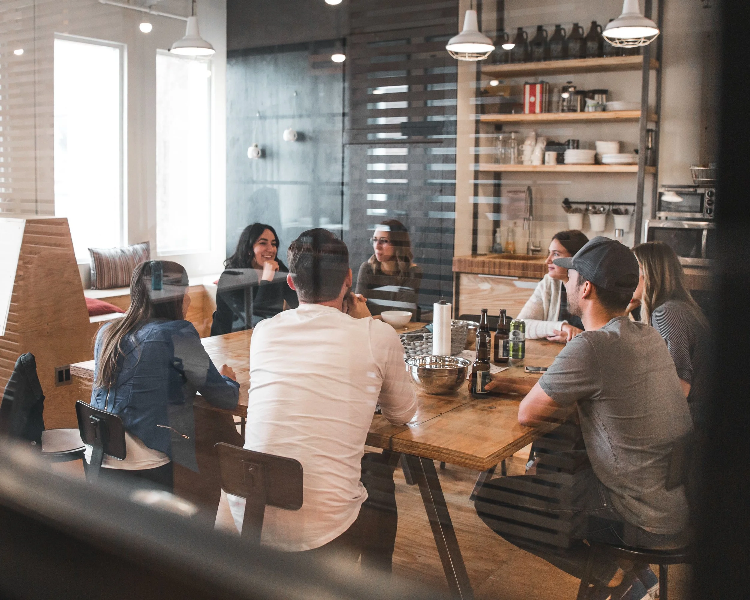 A diverse group of six people in a modern office meeting room, sitting around a long white table, engaging in a discussion with laptops, tablets, charts, and notebooks, with large windows showing outdoor landscaping.